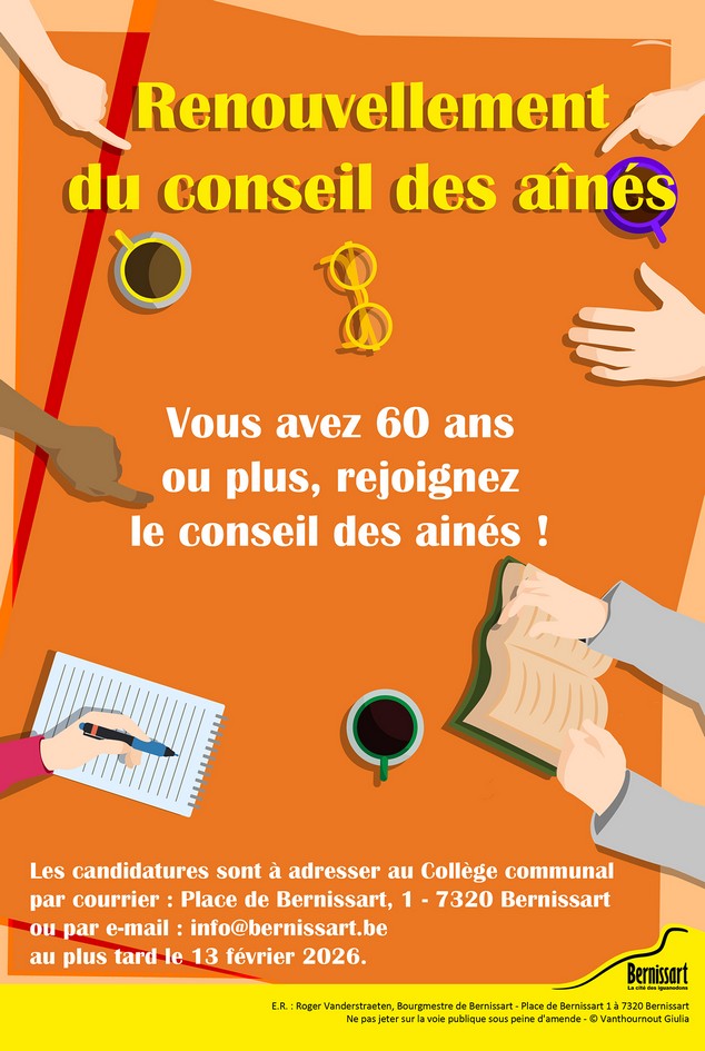 Dans le cadre de son Plan de Cohésion Sociale, la Commune de Bernissart accorde une place privilégiée à ses aînés. A cet effet, un Conseil des Aînés est mis en place depuis 2021.